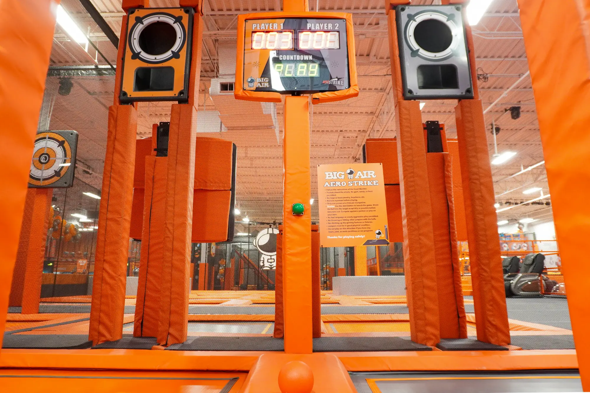 Compete one-on-one in two-minute rounds, aiming for the opposing bullseye targets on a trampoline court. Score the most hits for an intense, action-packed experience!