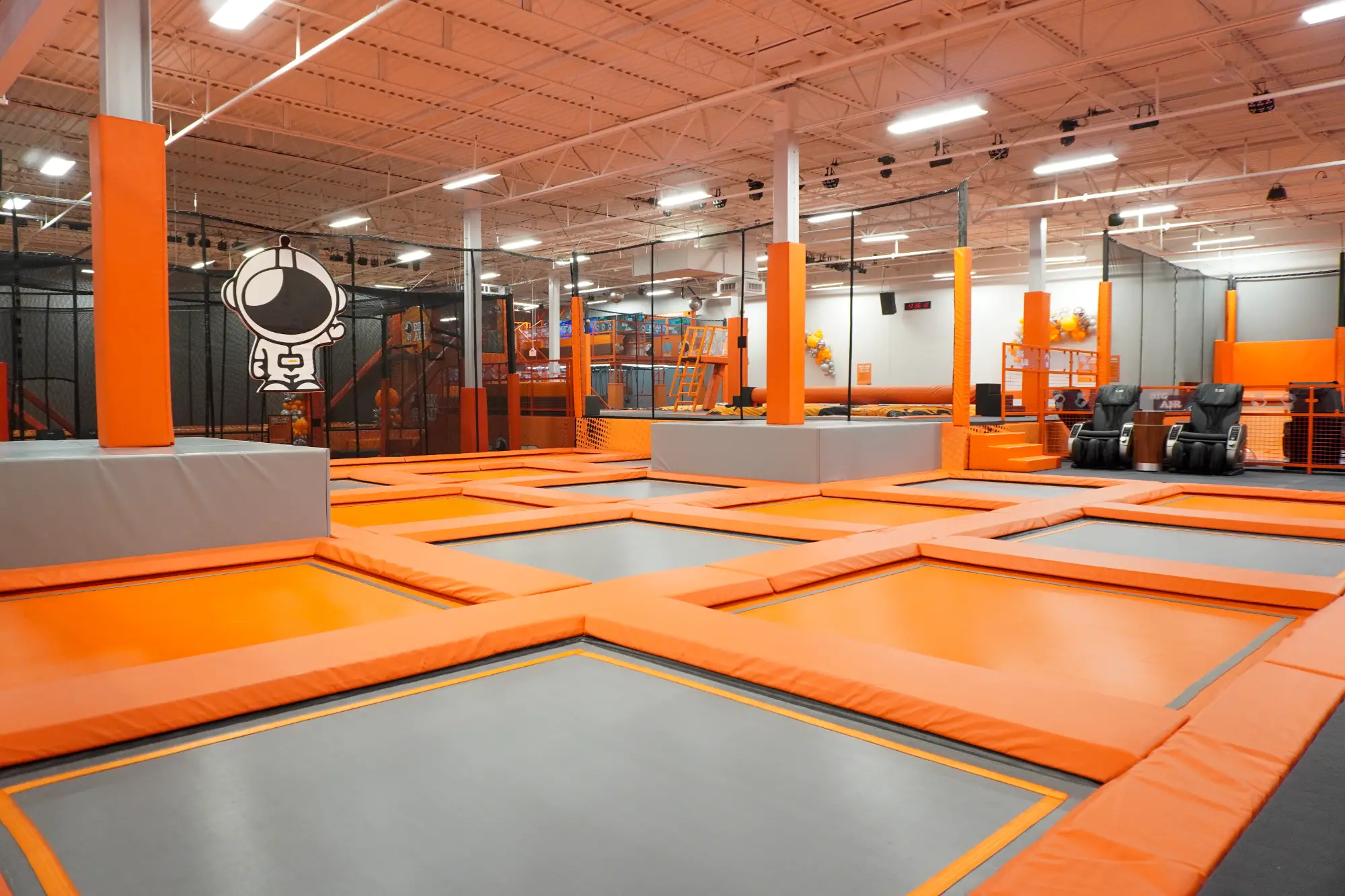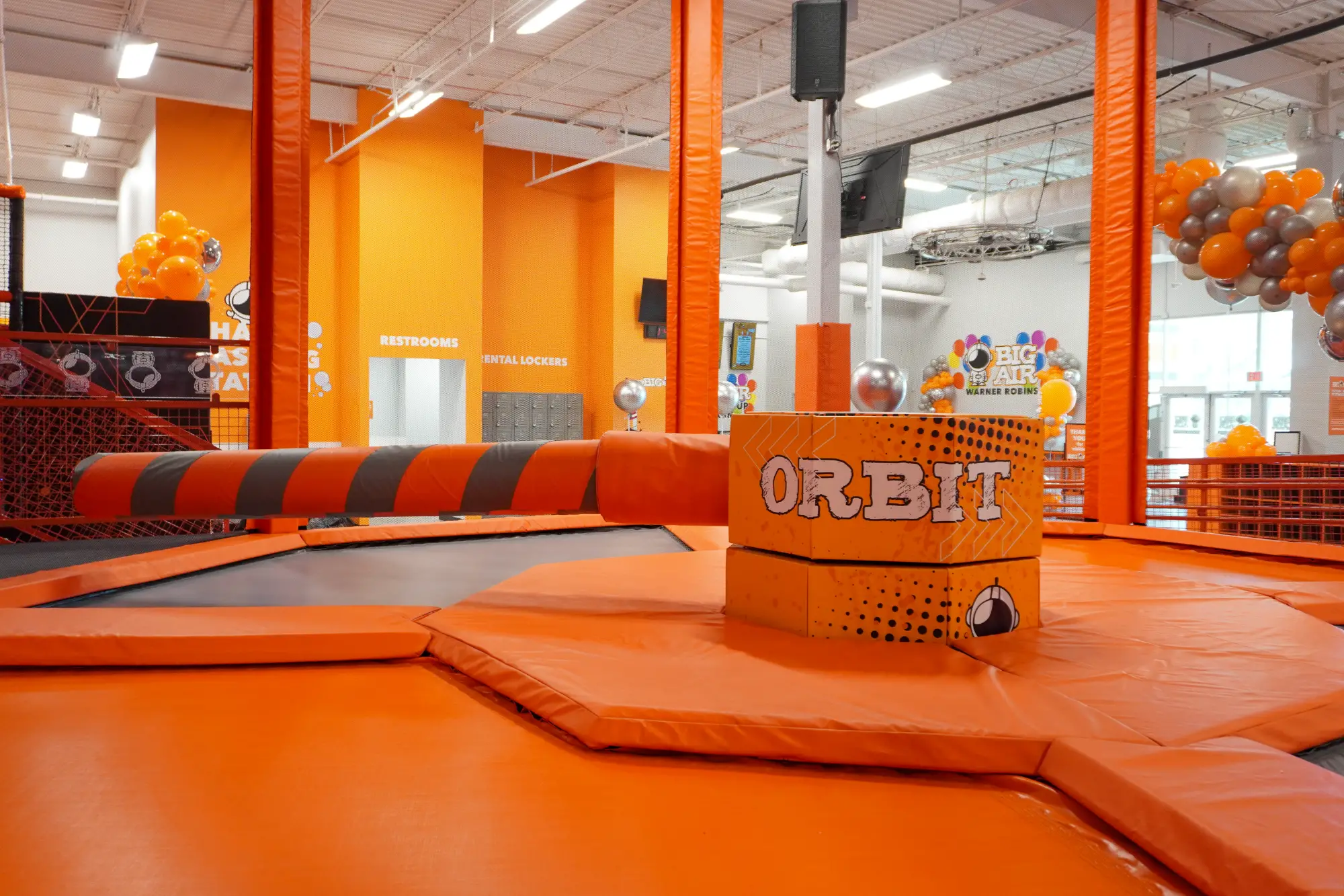 Spin into an epic, challenging session on The Orbit as you jump high or drop low on trampolines to dodge the spinning beams! Must be 48โณ to use this attraction.